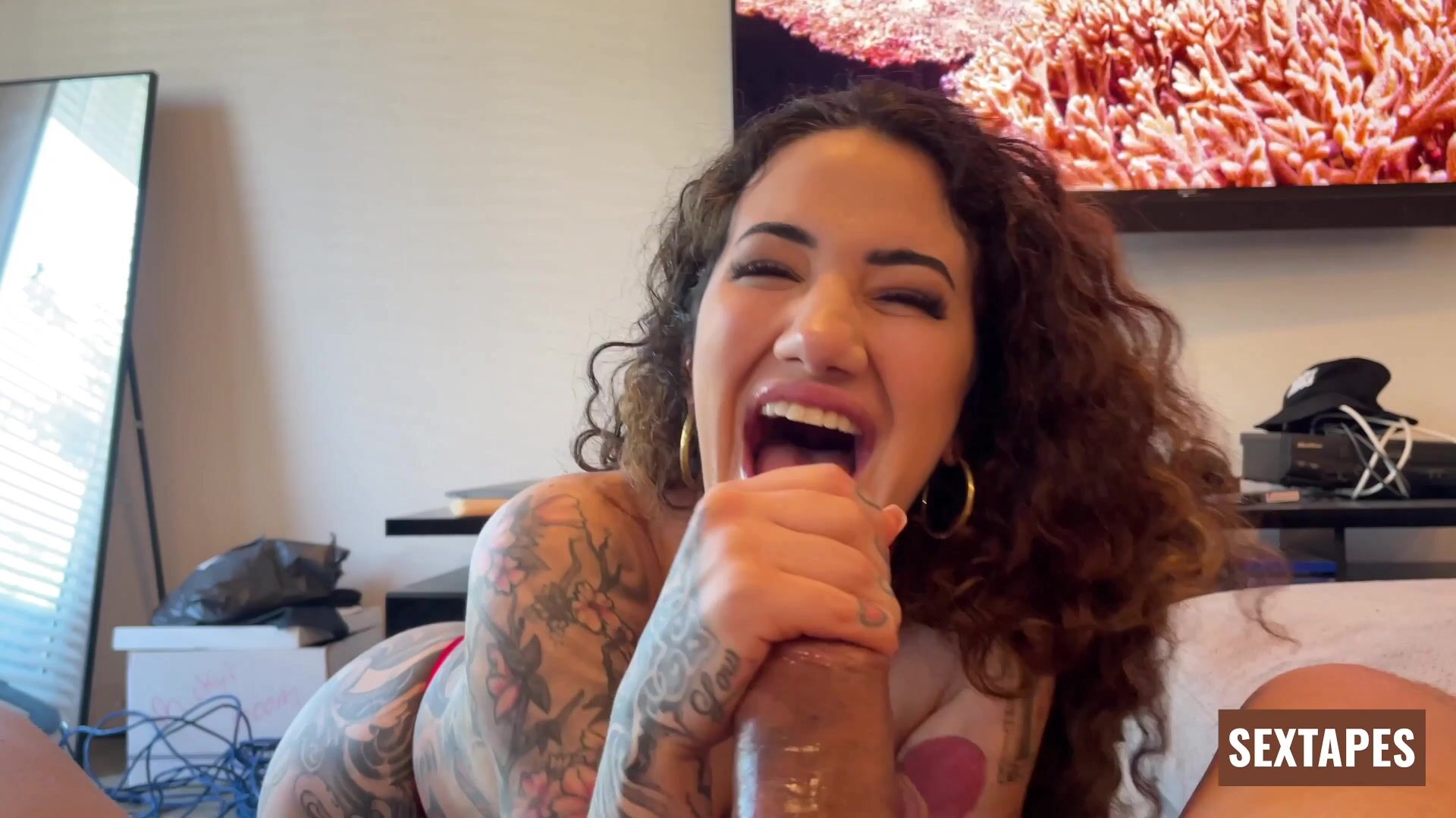 Arabelle Raphael takes it all in Sextapes’ “Gets Throat Fucked – POV Angle.” On her knees, the busty brunette gags on a massive cock, delivering deep throat, sloppy sucking, and raw interracial intensity.