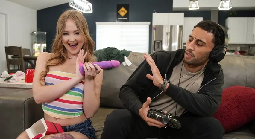 Natalia Queen finally gets the bright new dildo she ordered and wants her boyfriend to join in, but he’s too busy playing videogames to care. When he finally notices the toy, he bolts from the room. Fine. Natalia takes matters into her own hands and starts riding it on the kitchen island herself. Logan Xander almost catches her there and makes her show what she’s hiding. Once he sees it, he teases her mouth and pussy with the toy, then Natalia drops to suck him before climbing on top and riding him on the couch, getting the hard stuffing she was waiting for.